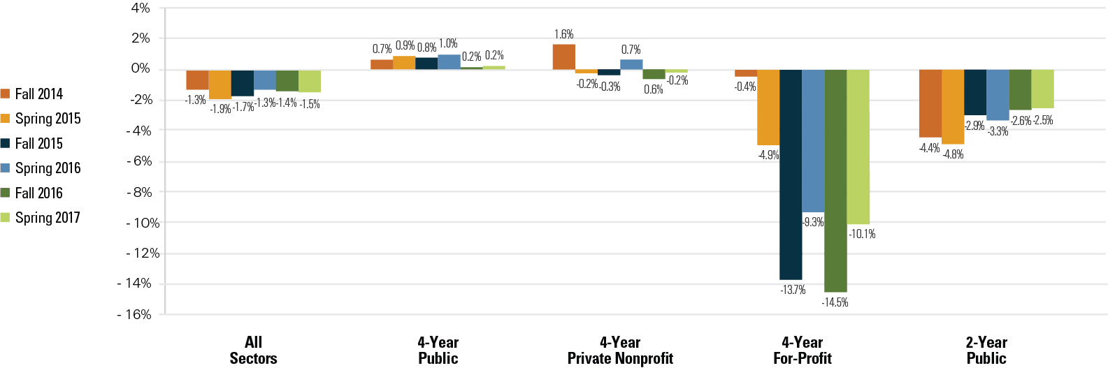 Figure 1: Percent Change from Fall to Spring, Enrollment by Sector (Title IV, Degree-Granting Institutions)