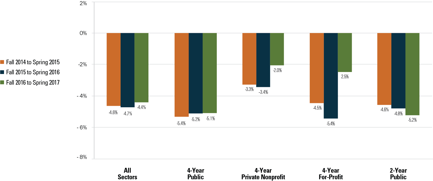 Figure 2 shows fall-to-spring percent changes in enrollments by institutional sector, for each of the last three years. In this figure, the fall-to-spring comparisons are limited to institutions that reported data to the Clearinghouse in both the fall and spring terms of an academic year. Typically, spring enrollments are lower than fall enrollments, but it is important to recognize that this is not an attrition rate for individual students. Rather, the drop represents the net effect of fall student attrition, graduation, and stopout, combined with new and returning spring student enrollments. The overall difference between fall and spring enrollment totals (all sectors) was unchanged in spring 2017, with enrollments 4.4 percent below the fall 2016 total.