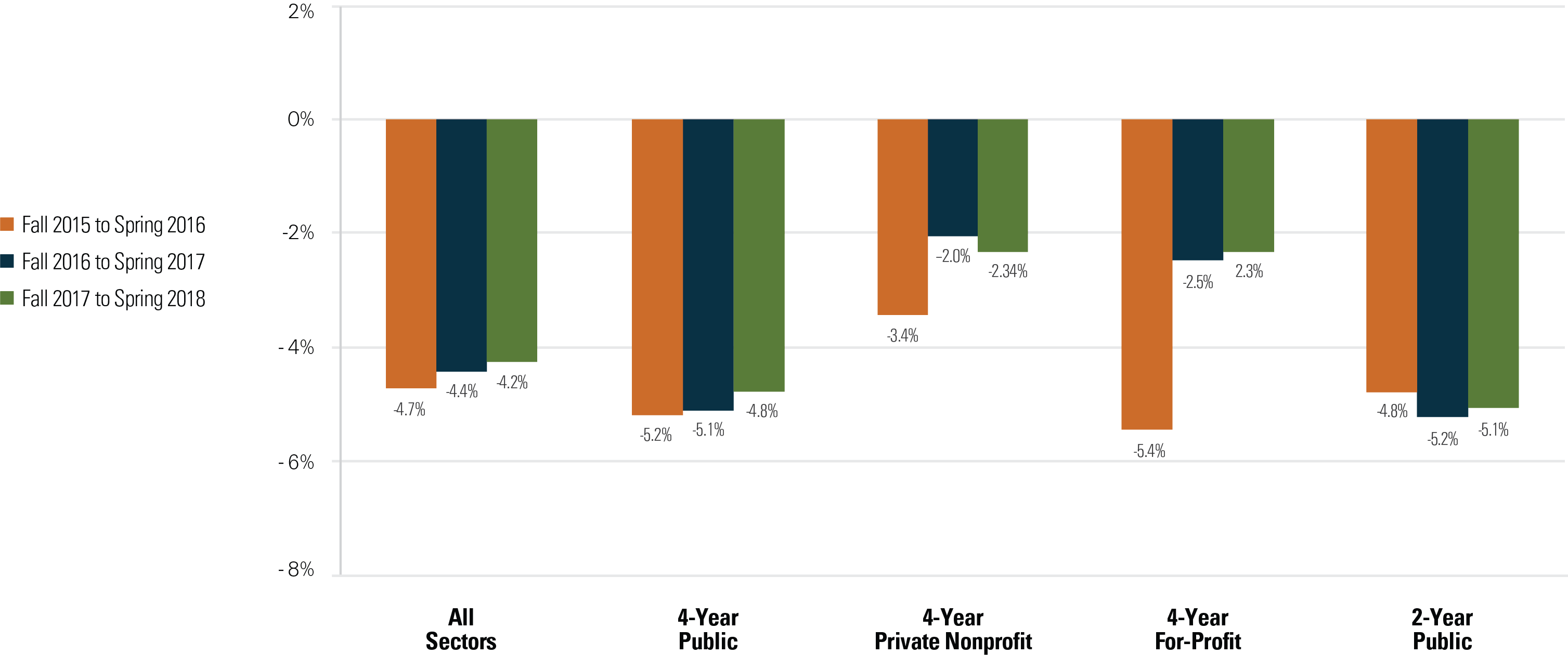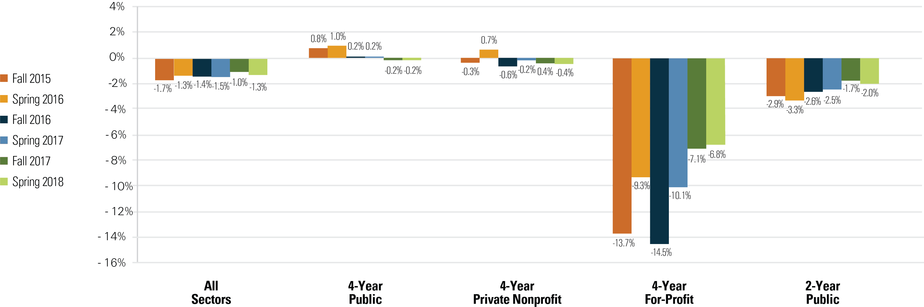 Figure 2: Percent Change from Fall to Spring, Enrollment by Sector (Title IV, Degree-Granting Institutions)