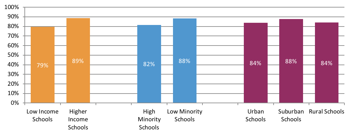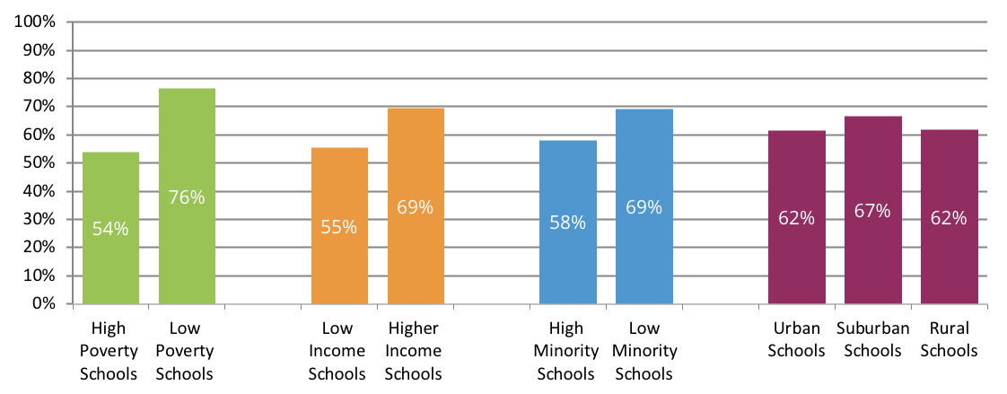 For schools in low income and higher income categories, we also have outcomes for graduates from a subset of low income schools defined as high-poverty schools (schools where at least 75 percent of the student population is eligible for free or reduced-price lunch) and a subset of higher-income schools as low-poverty (schools where less than 25 percent of the student population is eligible for free or reduced price lunch). Selected outcomes for high- and low-poverty schools are highlighted in the central part of the report. All outcomes can be found in Appendix B.