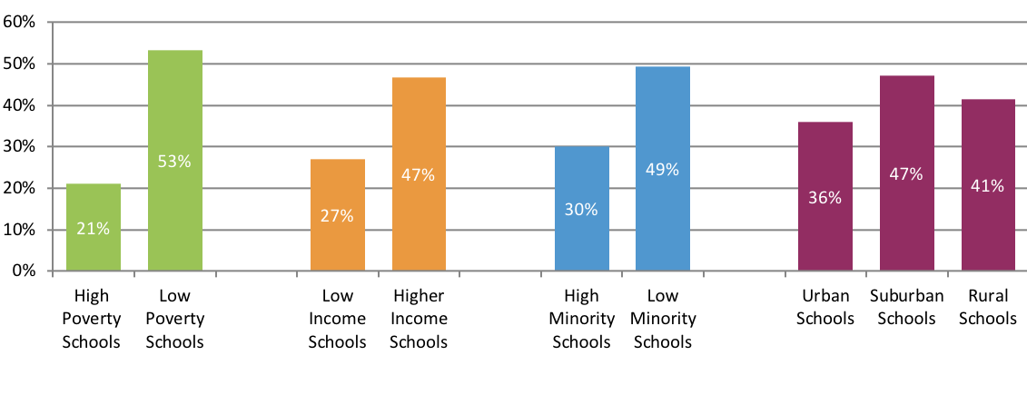 Students from higher-income high schools were 25 percent more likely to enroll in college immediately after high school than those from low-income schools (69 percent and 55 percent, respectively). The gap still persisted when looking at college enrollments within two years of high school graduation.