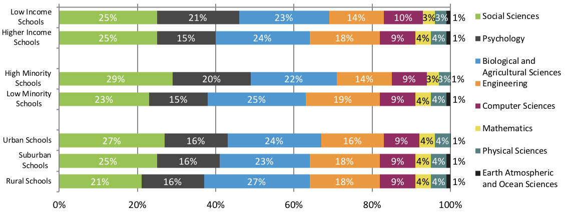 STEM degree completion was strongly associated with both the minority and income levels of originating high schools. Sixteen percent of graduates from higher-income schools, but only eight percent from low-income schools earned STEM degrees within six years after high school. Similarly, 17 percent of graduates from low-minority schools, but only 10 percent from high-minority schools completed STEM degrees within six years.