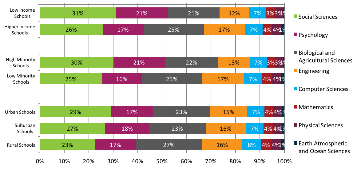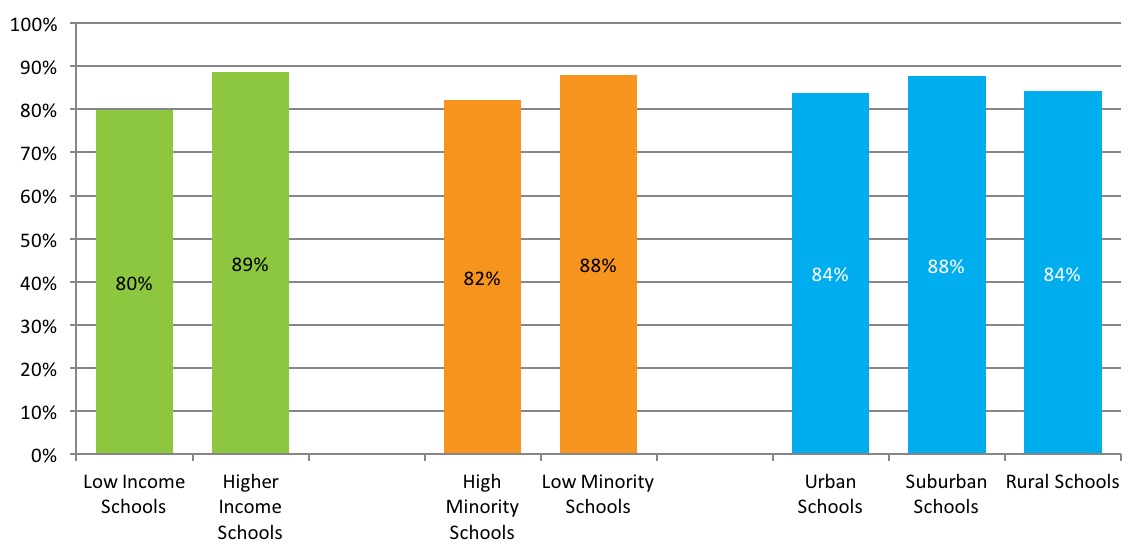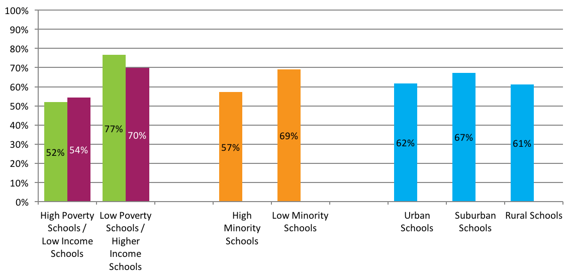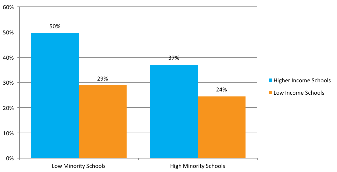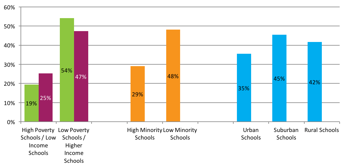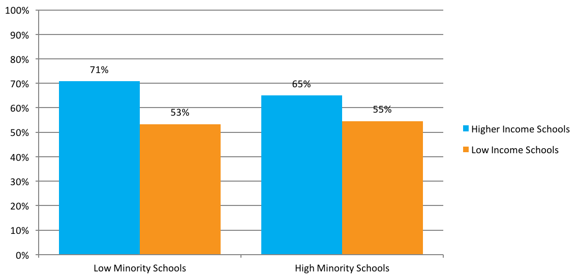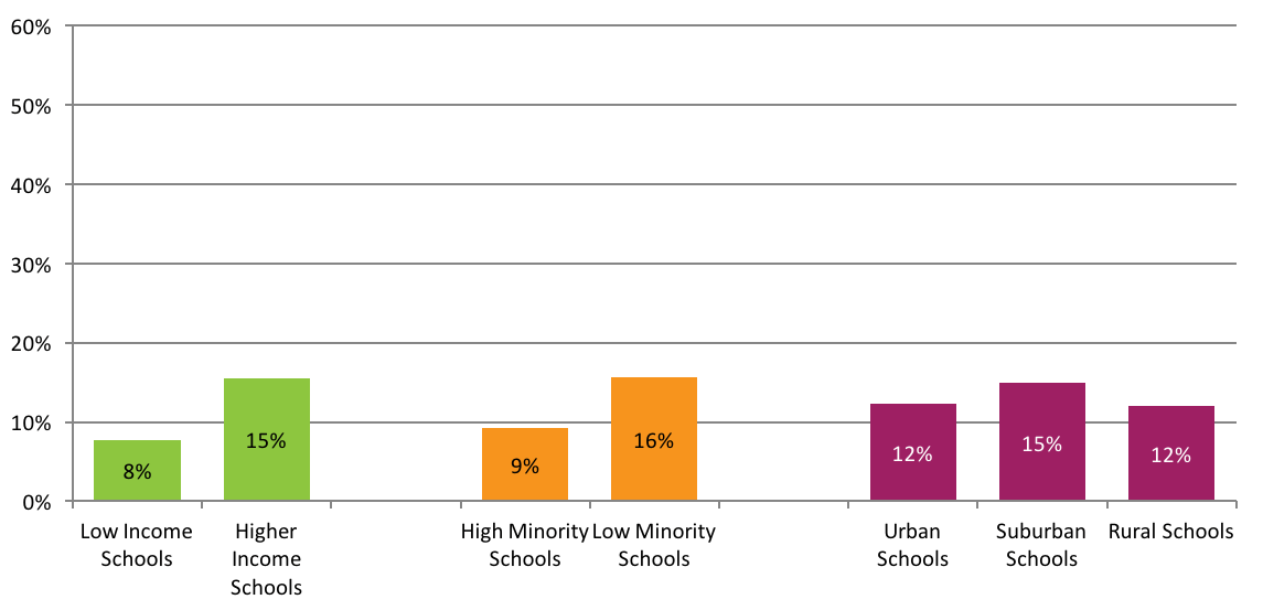 Low income schools are defined as schools where at least 50 percent of the entire student population (not just graduating seniors) is eligible for free or reduced price lunch. Minority schools are defined as those schools where at least 40 percent of the students are Black or Hispanic. Locale is defined by the NCES urban-centric locale code. Schools with a code from 11 to 13 are defined as urban. Schools with a code from 21 to 23 are defined as suburban. And those with a code 31 to 43, covering both town and rural areas, are defined as rural.