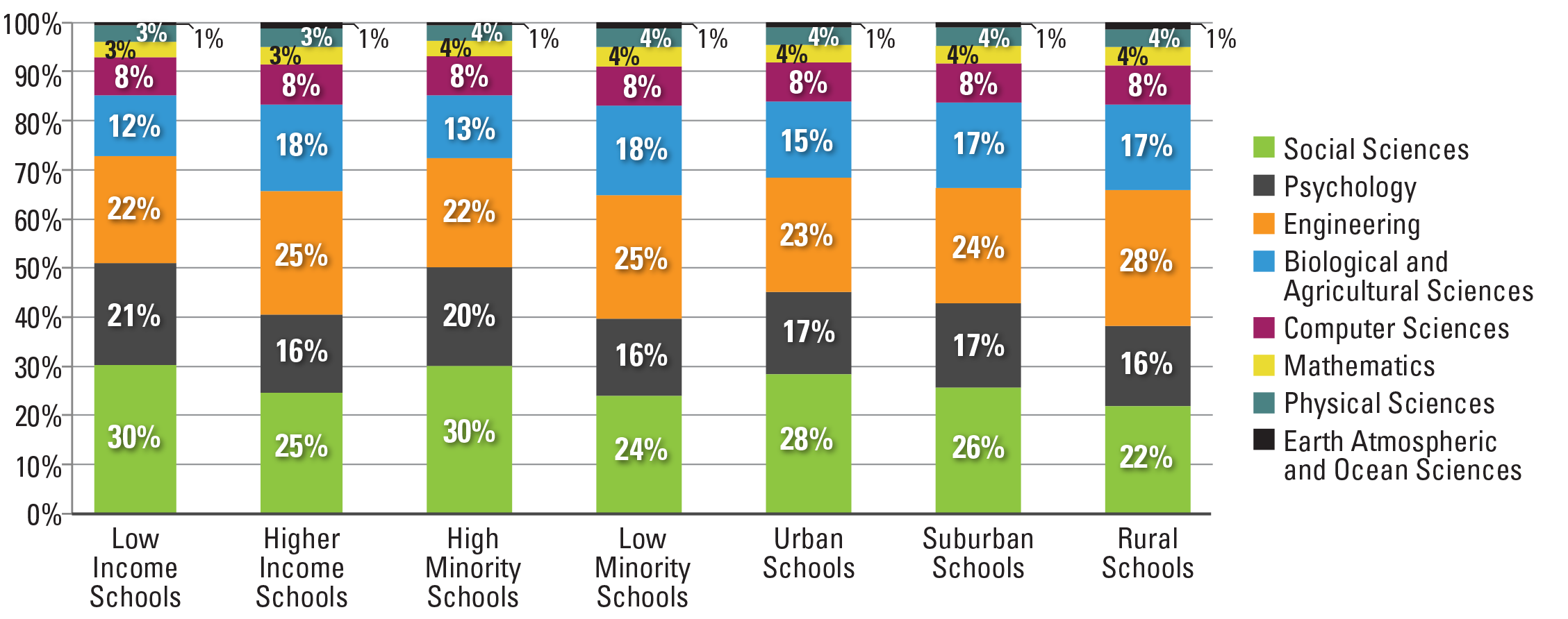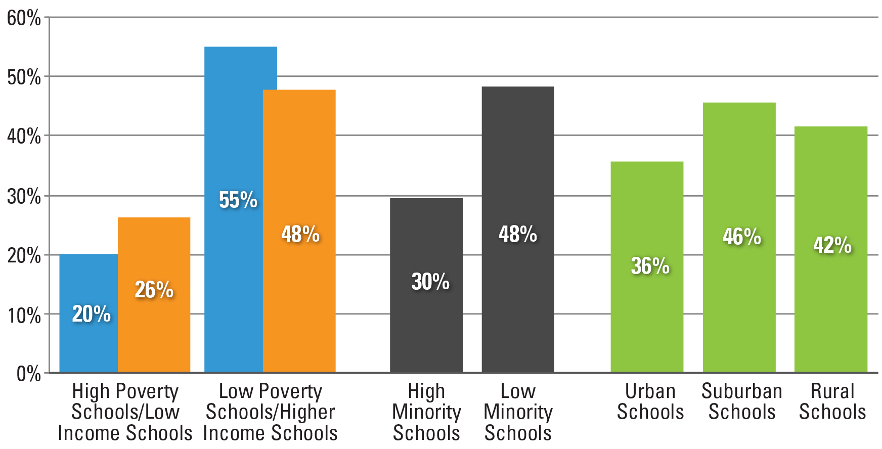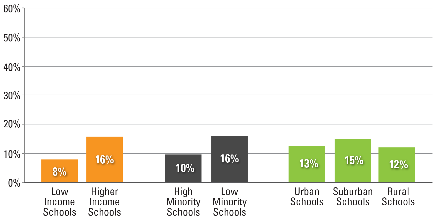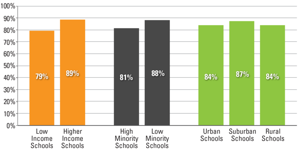 Low income schools are defined as schools where at least 50 percent of the entire student population (not just graduating seniors) is eligible for free or reduced price lunch. Minority schools are defined as those schools where at least 40 percent of the students are Black or Hispanic. Locale is defined by the NCES urban-centric locale code. Schools with a code from 11 to 13 are defined as urban. Schools with a code from 21 to 23 are defined as suburban. And those with a code 31 to 43, covering both town and rural areas, are defined as rural.