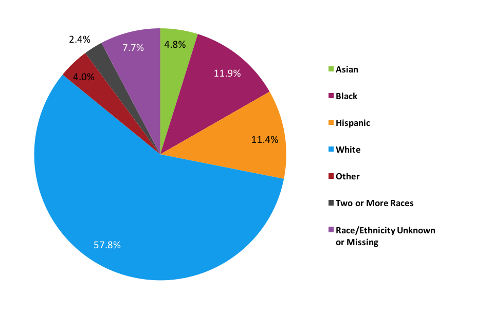 Figure 1 shows the sample fall 2010 cohort (Weighted N= 2,823,678) disaggregated by race and ethnicity. The largest proportion (57.8 percent) were white students, followed by black (11.9 percent), Hispanic (11.4), and Asian (4.8 percent) students. These four groups of students represented about 86% of the total fall 2010 cohort (Figure 1). Regardless of racial or ethnic background, women accounted for more than half of the sample (Figure 2). In terms of age, most students were traditional age students (i.e., 20 years old or younger) when they first started their postsecondary studies (Figure 3). However, approximately one in five black (21.7 percent) students were adult learners (i.e., older than 24 years old), nearly double the proportion of adult learners among Asian (11.2 percent), Hispanic (12.3 percent), and white (13.4 percent) students. When disaggregated by institutional type, Asian (45.1 percent) and white (45.9 percent) students were more likely to start at a four-year public institution than black (36.6 percent) or Hispanic (36.3 percent) students, whereas black (48.5 percent) and Hispanic (50.8 percent) students were more likely to start at a two-year pubic institution than white (35.6 percent) and Asian (37.8 percent) students (Figure 4). In terms of enrollment intensity, the most common enrollment intensity was mixed enrollment (a combination of full- and part-time enrollment over six years) across all races (Asian 57.1 percent; black 60.2 percent; Hispanic 62.6 percent; and white 50.9 percent), followed by exclusively full-time enrollment and exclusively part-time enrollment (Figure 5).