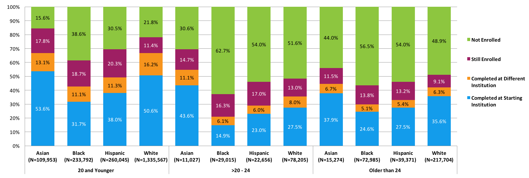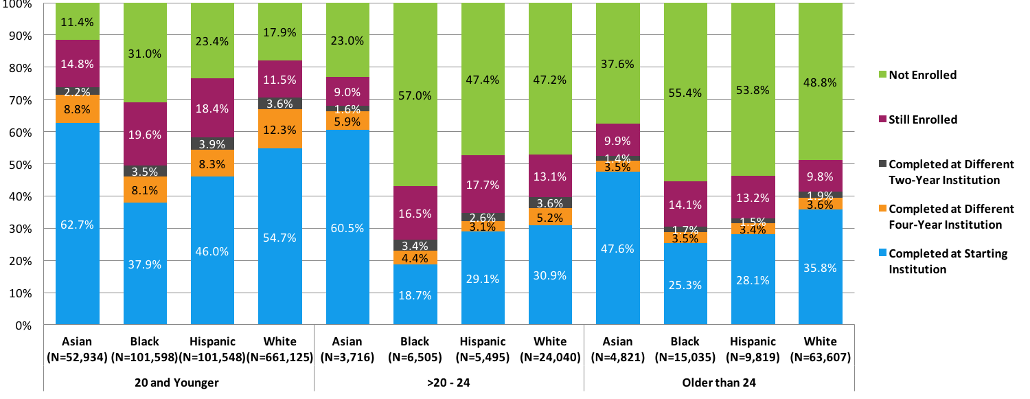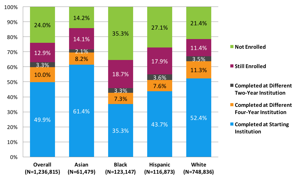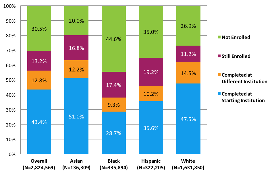 - The completion rate in this report includes students who completed a degree or certificate at a different institution from where they started, answering the unaddressed hypothesis that perhaps some racial and ethnic groups of students, with otherwise lower same-institution graduation rates, might have higher transfer-completion rates, thereby partially closing the gap in total completion rates.