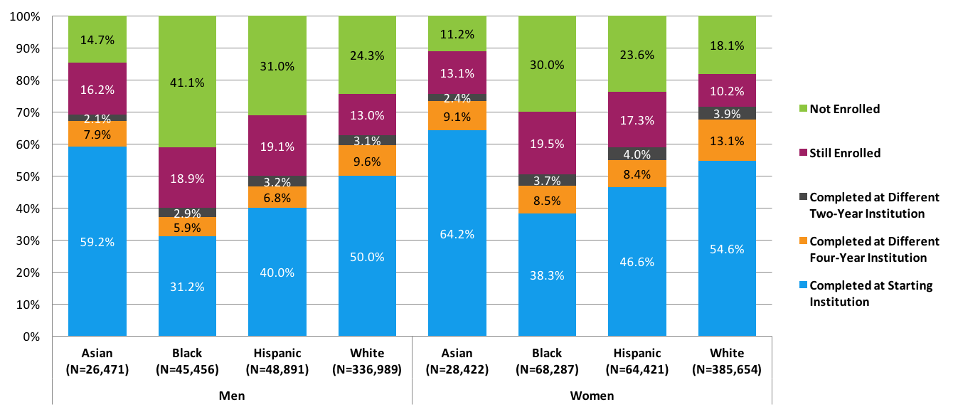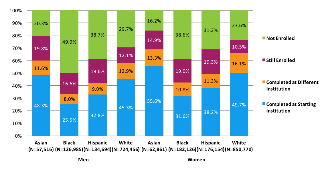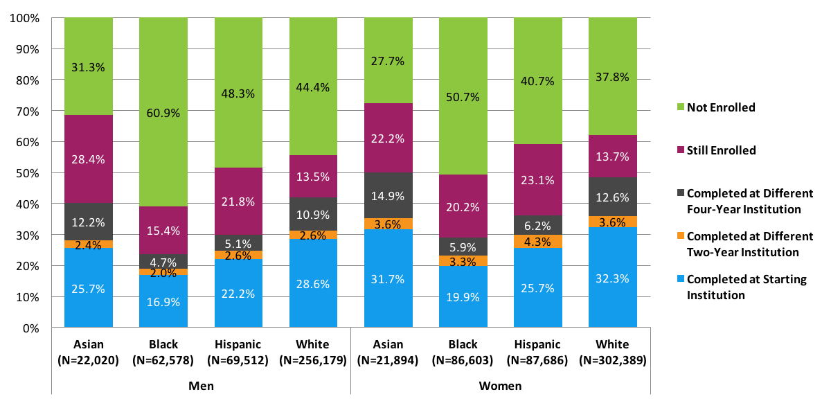 - Among students who started in four-year public institutions, black men had the lowest completion rate (40.0 percent) and the highest stop-out rate (41.1 percent). Asian women had the highest completion rate (75.7 percent) and the lowest stop-out rate (11.2 percent).