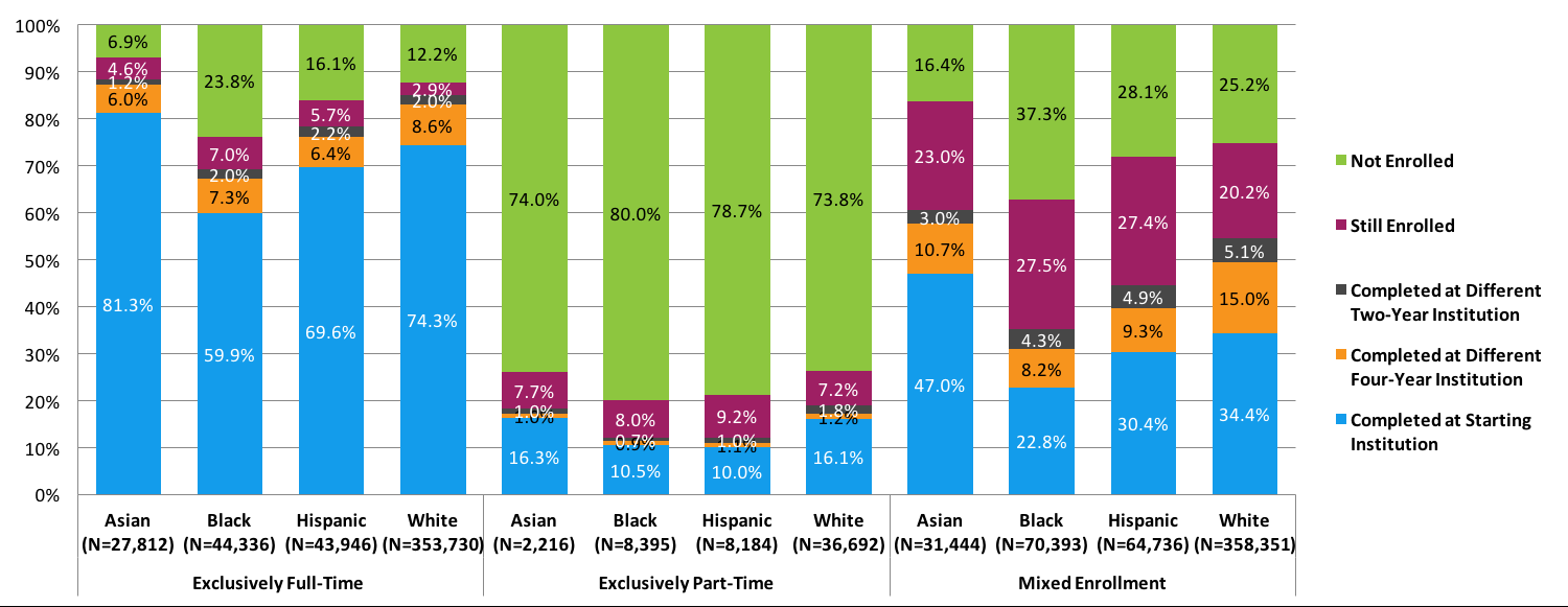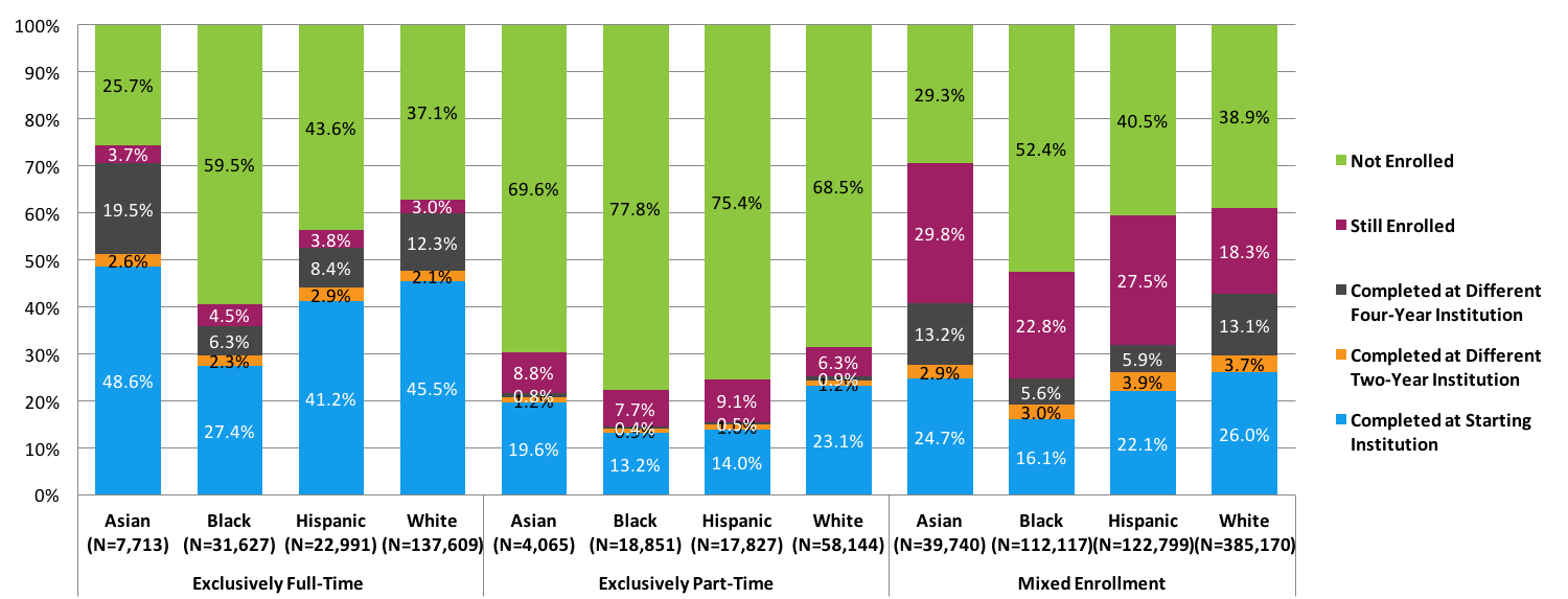 The report includes students who started part-time, covering important enrollment pathways that may be disproportionately pursued by some racial and ethnic groups, and which standard metrics of first-time full-time students only may miss.