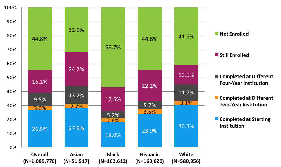- The completion rate at four-year institutions for students who started at a community college (with or without receiving an associate’s degree first) was dramatically different for students of different racial and ethnic groups. While almost one in four Asian students and one in five white students had completed this transfer pathway by the end of the six-year study period, just one in 10 Hispanic students and about one in 12 black students did.