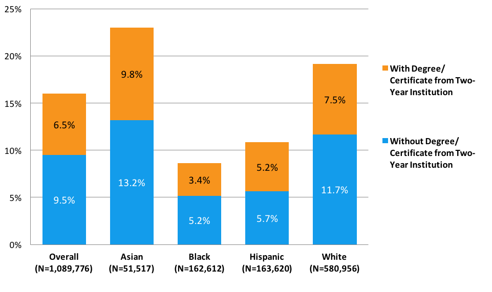 Figure 15. Completions at Four-Year Institutions for Students Who Started at Two-Year Public Institutions by Race and Ethnicity (N=1,089,776)*
