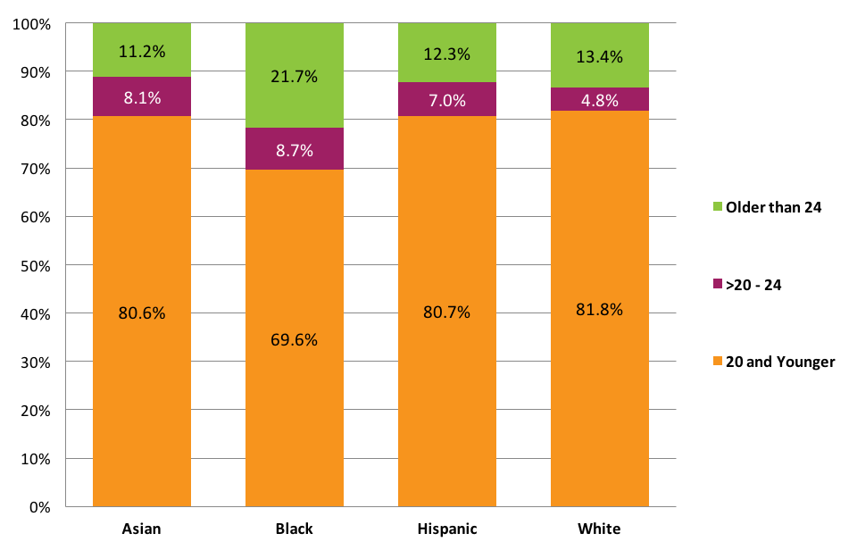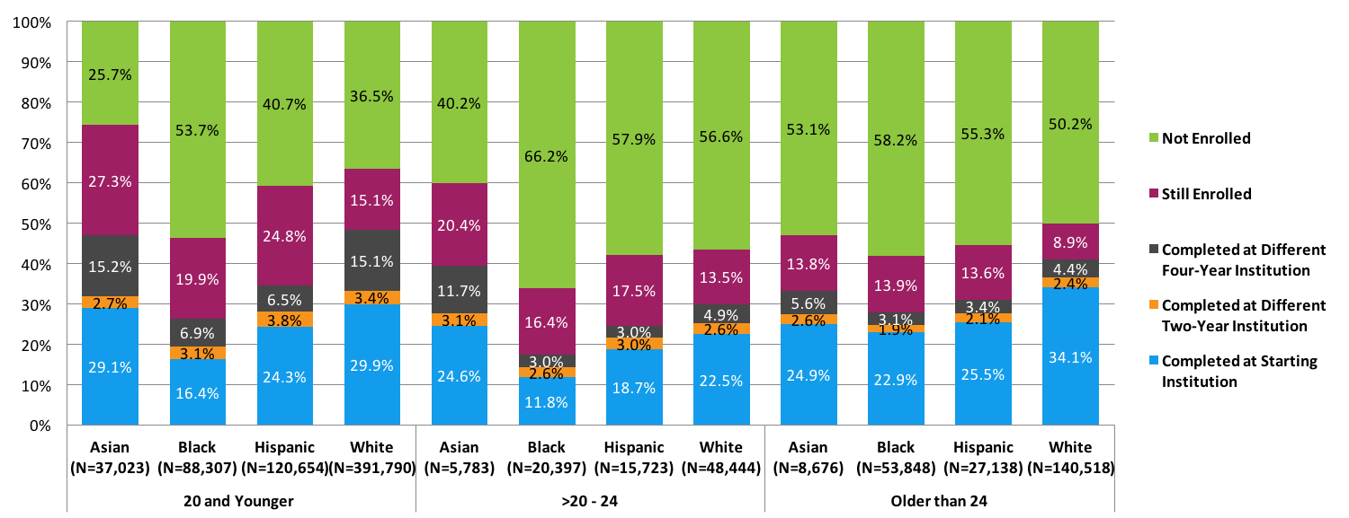 - The completion gaps between racial groups tend to shrink as students grow older. Among traditional-age students, there was a 24-percentage point gap in the completion rates of black and white students (42.7 percent and 66.8 percent, respectively) and 17.5-percentage points gap between Hispanic and white students (49.3 percent and 66.8 percent, respectively). Among adult learners (those who started college at 25 or older), however, the gap was 12.3 percentage points (29.7 percent and 42.0 percent, respectively) between black and white students and just 9.1 percentage points between Hispanic and white students (32.9 percent and 42.0 percent, respectively).