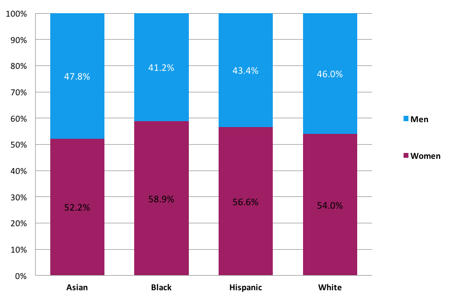 When disaggregated by gender within each race and ethnicity category, we observed differences in completion rates between men and women within each race and ethnicity category, as well as differences by race and ethnicity within each gender category. In every race and ethnicity category women outperformed men. The gap in completion rates between men and women ranged from 5.4 percentage points among black students to 9.9 percentage points among Asian students.