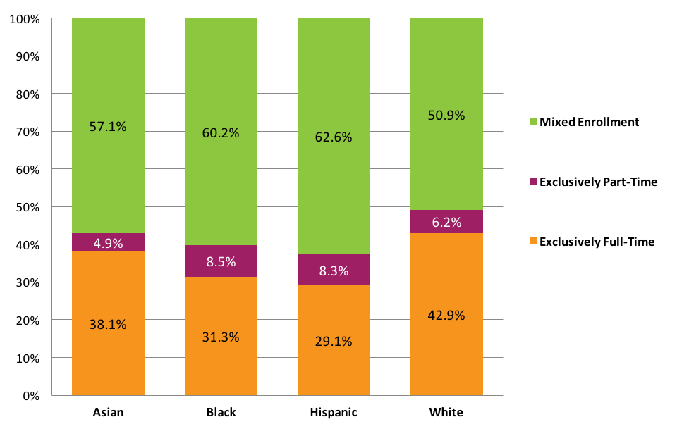 This pattern is reversed when looking at the not enrolled categories, where within each age group, black students were most likely not to be enrolled, followed by Hispanic, white, and Asian students. Among black, Hispanic, and white students, adult learners showed higher completion rates than delayed entry students. The completion rates by enrollment intensity show that exclusively full-time students displayed the highest completion rates and exclusively part-time students showed the highest proportion of students who dropped out, regardless of race and ethnicity (Figure 9).