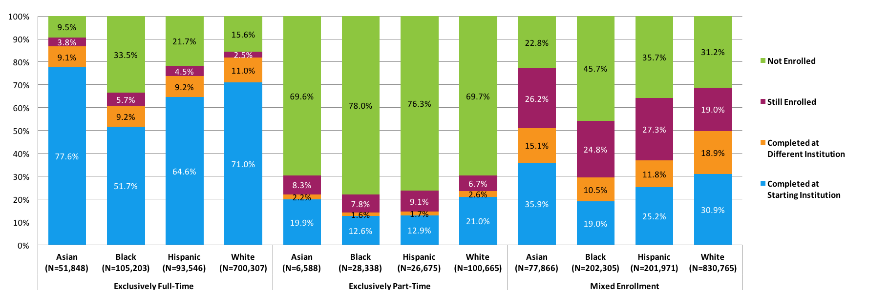 Figure 13. Six-Year Outcomes for Students Who Started at Four-Year Public Institutions by Race and Ethnicity and Enrollment Intensity (N=1,050,235)*