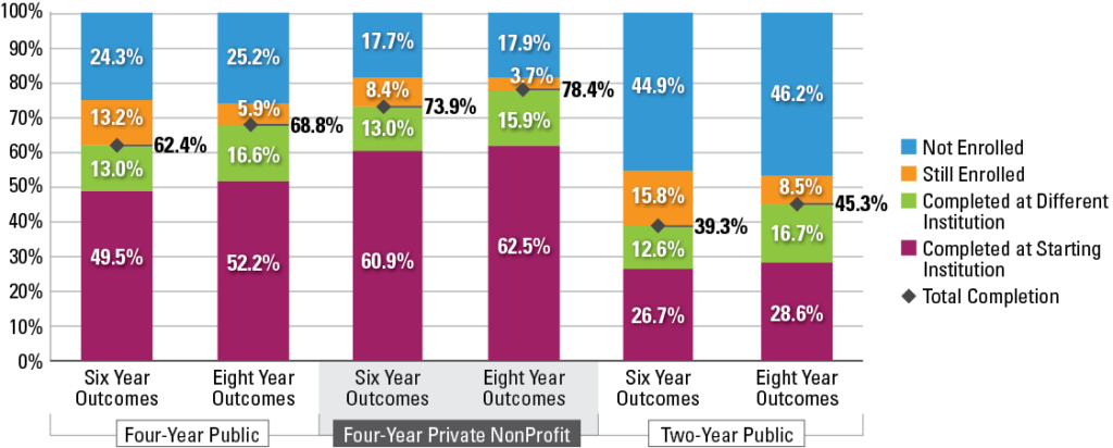 Figure 2. Six-Year and Eight-Year Overall Outcomes by Starting Institution Type for the Fall 2010 Cohort