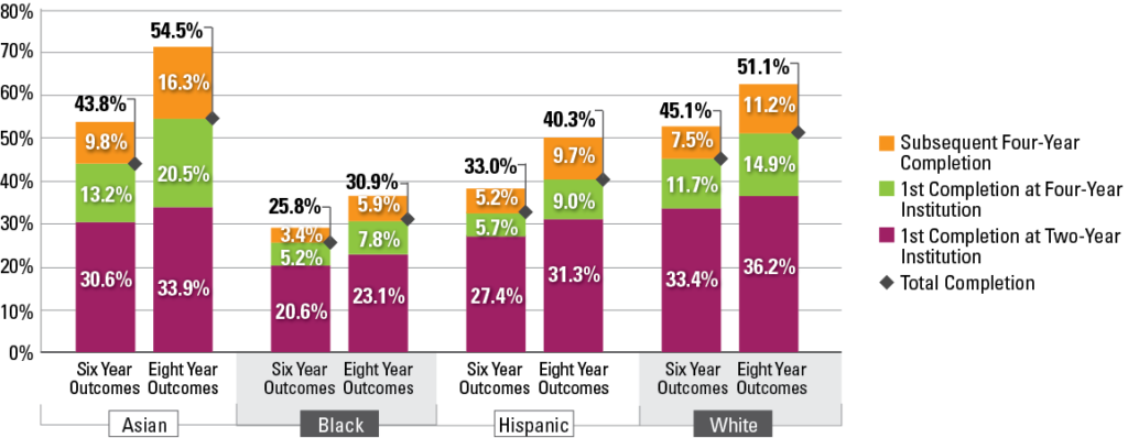 In terms of four-year completions for two-year starters, an additional 13.8 percent of Asian students subsequently completed a four-year degree at the end of eight years (from 23.0 percentage points to 36.8 percentage points), followed by Hispanic students, with an additional 7.9 percent total four-year completions (from 10.8 percentage points to 18.7 percentage points).