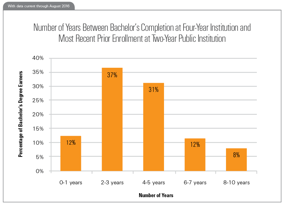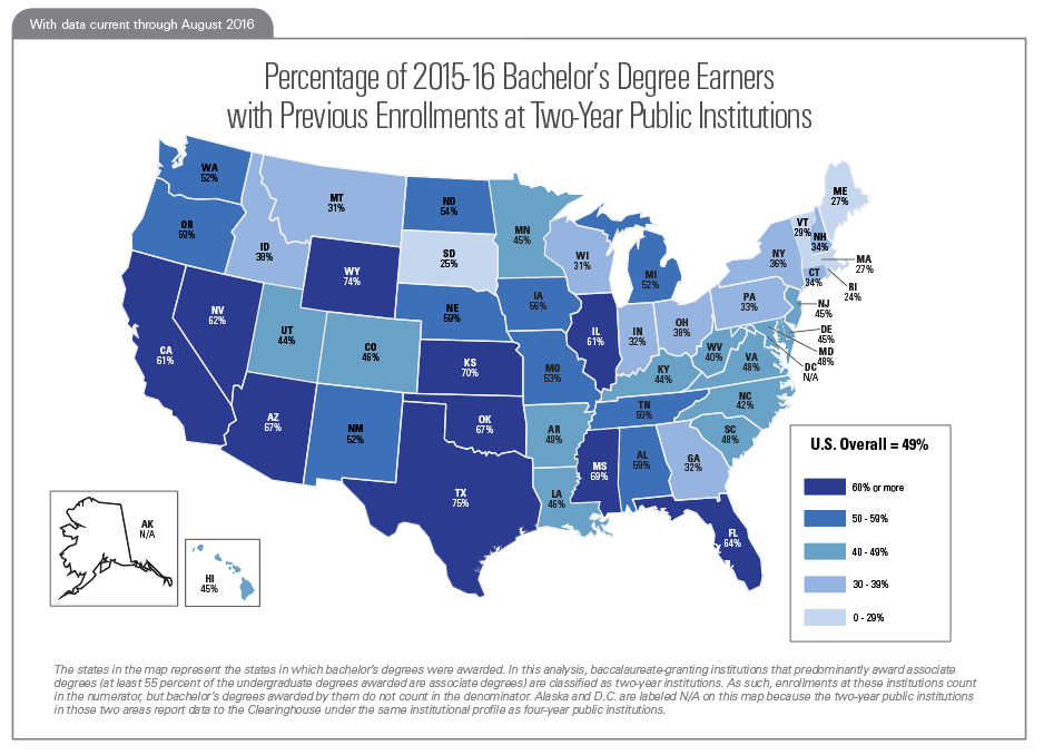 In the 2015-16 academic year, 49 percent of all students who completed a bachelor’s degree at a four-year institution had been enrolled at a two-year public institution at some point in the previous 10 years.