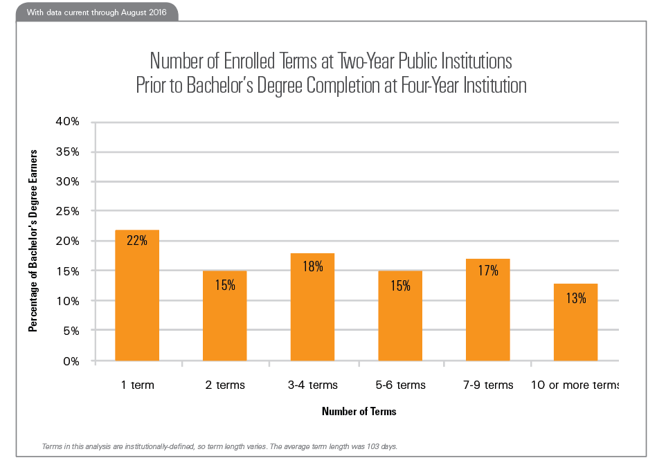 Forty-nine percent of all 2015-16 bachelor’s degree earners at four-year institutions had been enrolled at a two-year public institution at some point in the previous 10 years. Almost two-thirds of these students (63 percent) were enrolled in two-year public institutions for three or more terms.