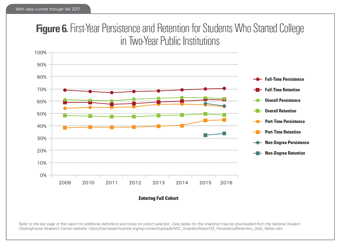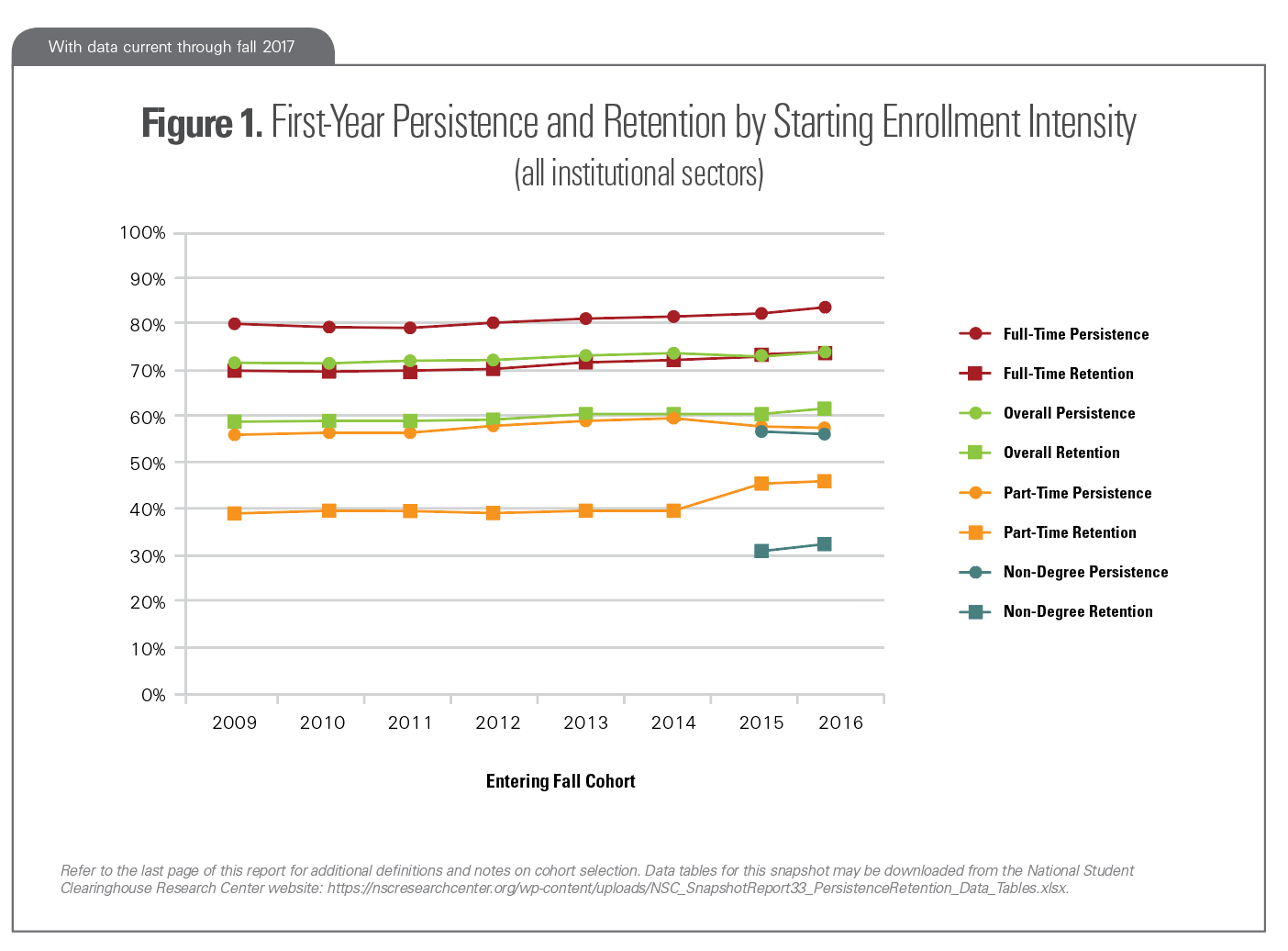 Beginning with the fall 2015 entering cohort, the NSC Research Center is able to report non-degree-seeking students in a separate category from full-time and part-time students. For previous entering cohorts, non-degree-seeking students are included in the full-time and part-time categories. Non-degree-seeking students are included in the overall rates for all entering cohort years.