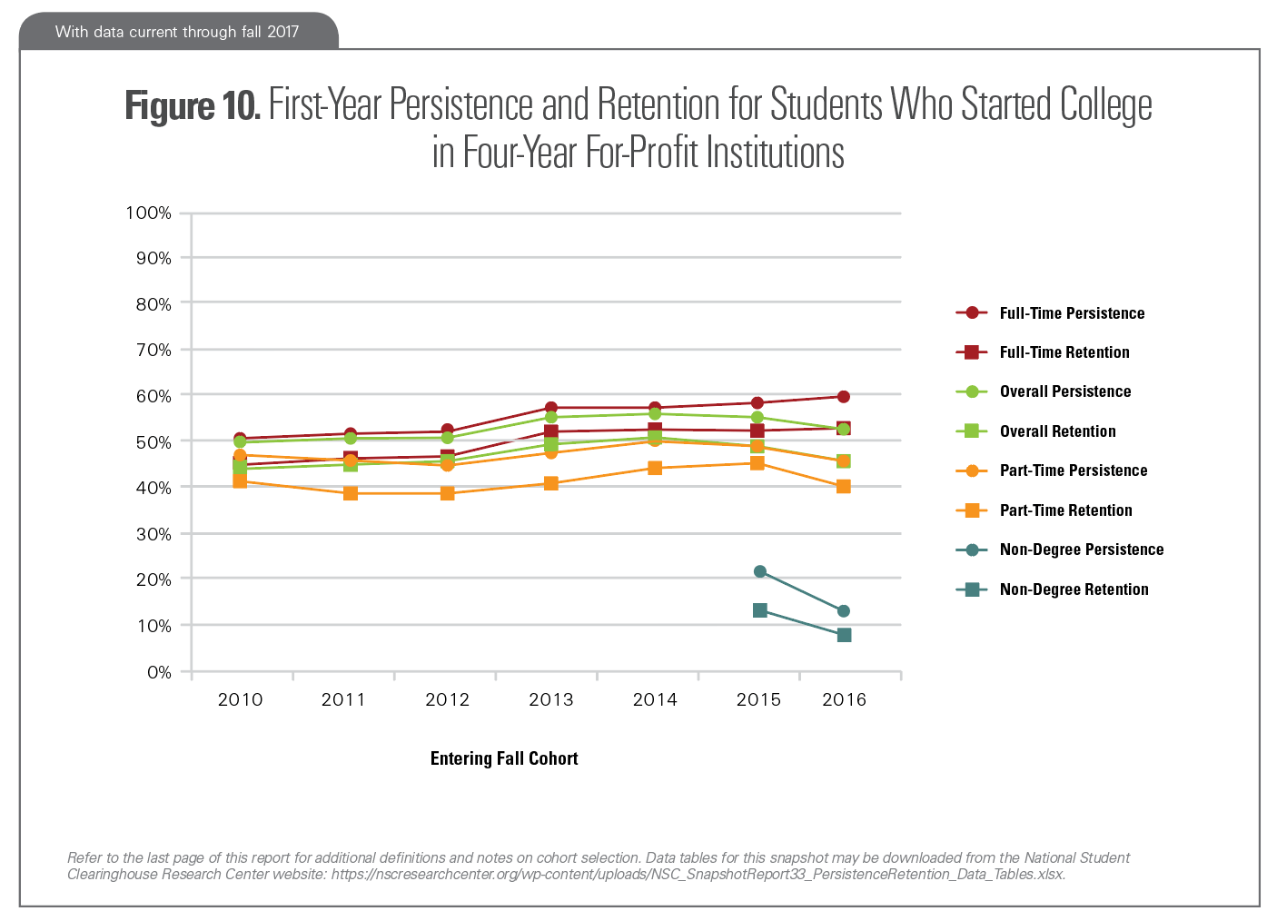 For students who started college in four-year for-profit institutions, the persistence rate was 52.9 percent, down 2.8 percentage points from the prior year, but up 2.8 percentage points in comparison to the fall 2010 cohort. The persistence rate was 60.6 percent for those who entered college on a full-time basis, compared to 46.1 percent for those who entered college on a part-time basis. Of all students who started college in this sector in fall 2016, 46.2 percent returned to the same institution in fall 2017.