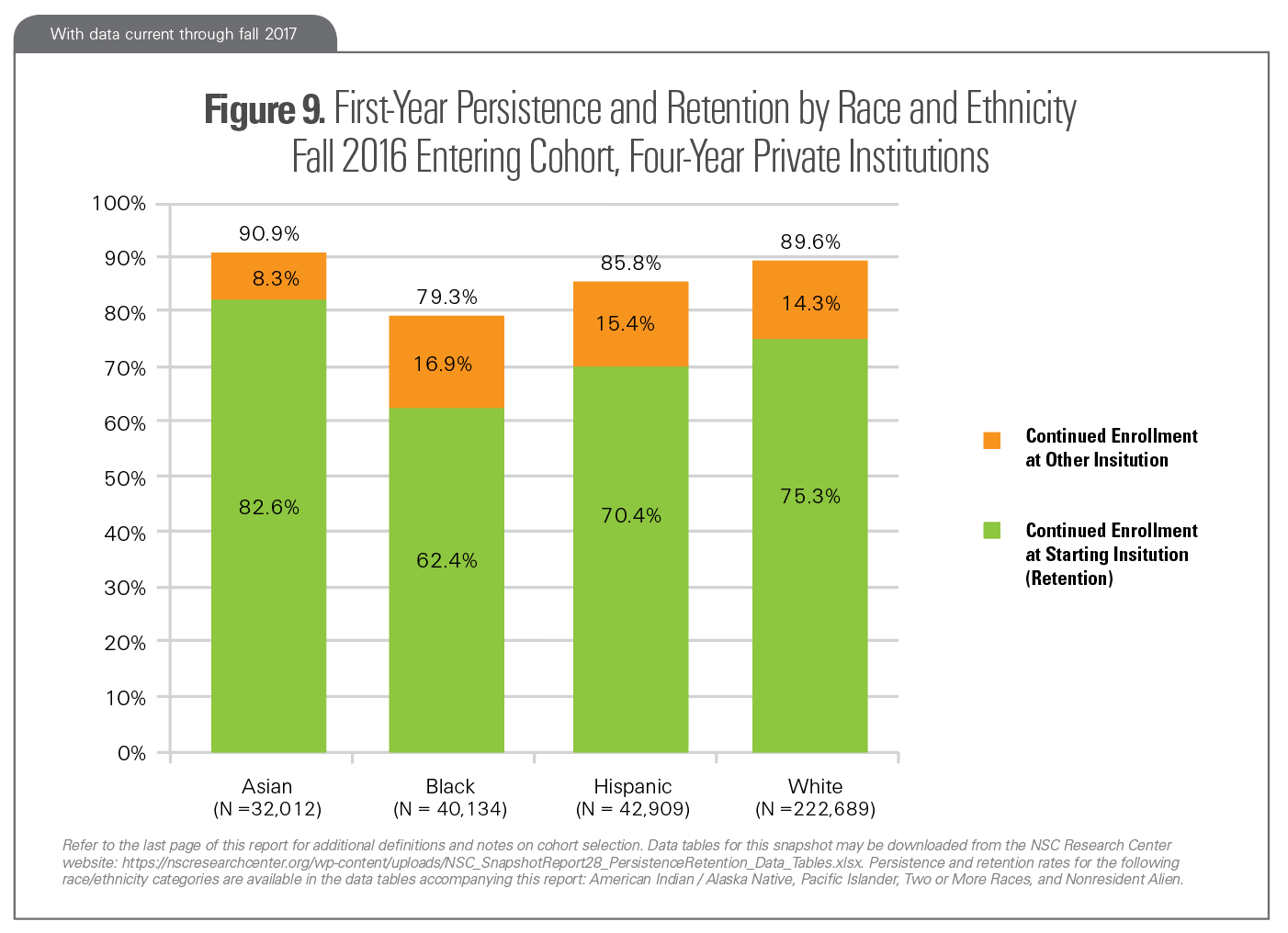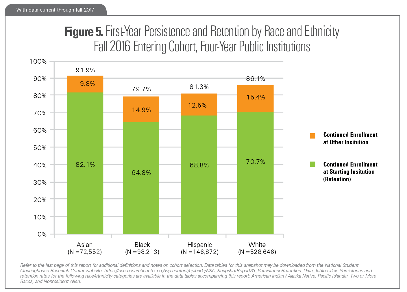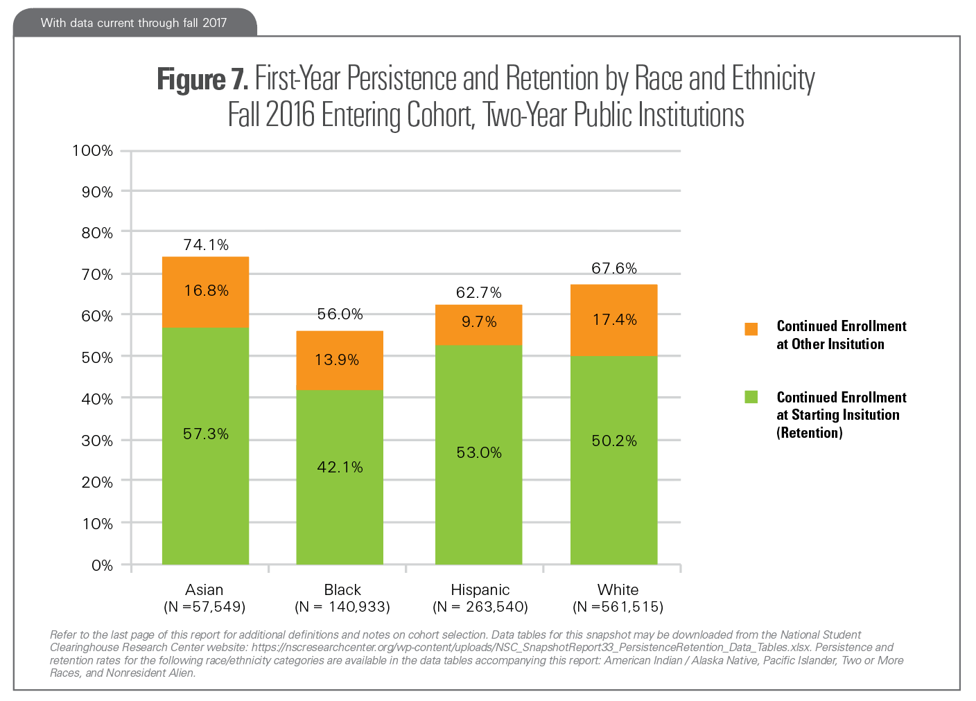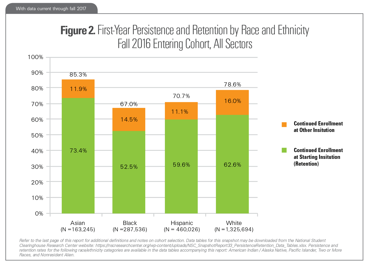 Refer to the last page of this report for additional definitions and notes on cohort selection. Download the data tables for this snapshot. Persistence and retention rates for the following race/ethnicity categories are available in the data tables accompanying this report: American Indian / Alaska Native, Pacific Islander, Two or More Races, and Nonresident Alien.