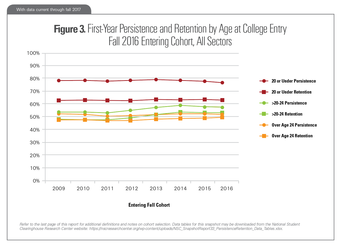 Fall 2016 entering college students who were in the >20-to-24 age group (at college entry) had a persistence rate of 57.7 percent. This represents an increase of 3.6 percentage points over the fall 2009 entering cohort. Students in the 20 and under age group had a persistence rate of 77.3 percent, down 1.7 percentage points from the fall 2009 entering cohort. This group also showed the highest spread between persistence and retention rates, with about 14 percent, or one in seven students, enrolling in a different institution in their second fall term. Students who were over age 24 at college entry had a persistence rate of 52.6 percent, a figure that has remained essentially flat across the cohorts shown in this report.