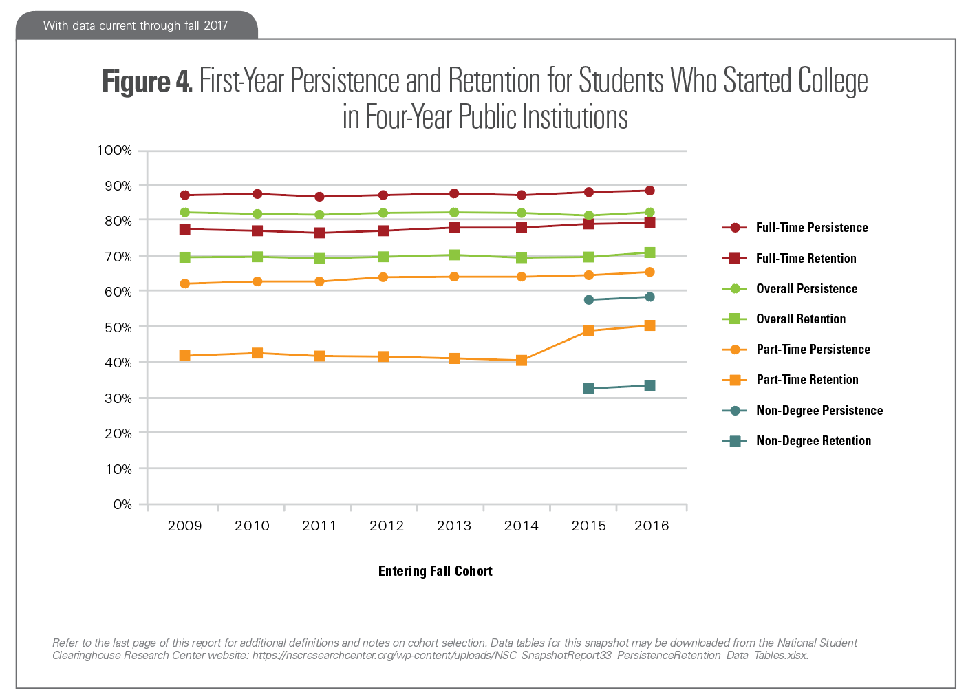 For students who started college in fall 2016 at four-year public institutions, the persistence rate was 83.0 percent, up 1.3 percentage points from the prior year, and up 0.7 percentage points in comparison to the fall 2009 cohort. The persistence rate was 88.9 percent for those who entered college on a full-time basis, compared to 65.7 percent for those who entered college on a part-time basis. Of all students who started college in this sector in fall 2016, 71.2 percent returned to the same institution in fall 2017.