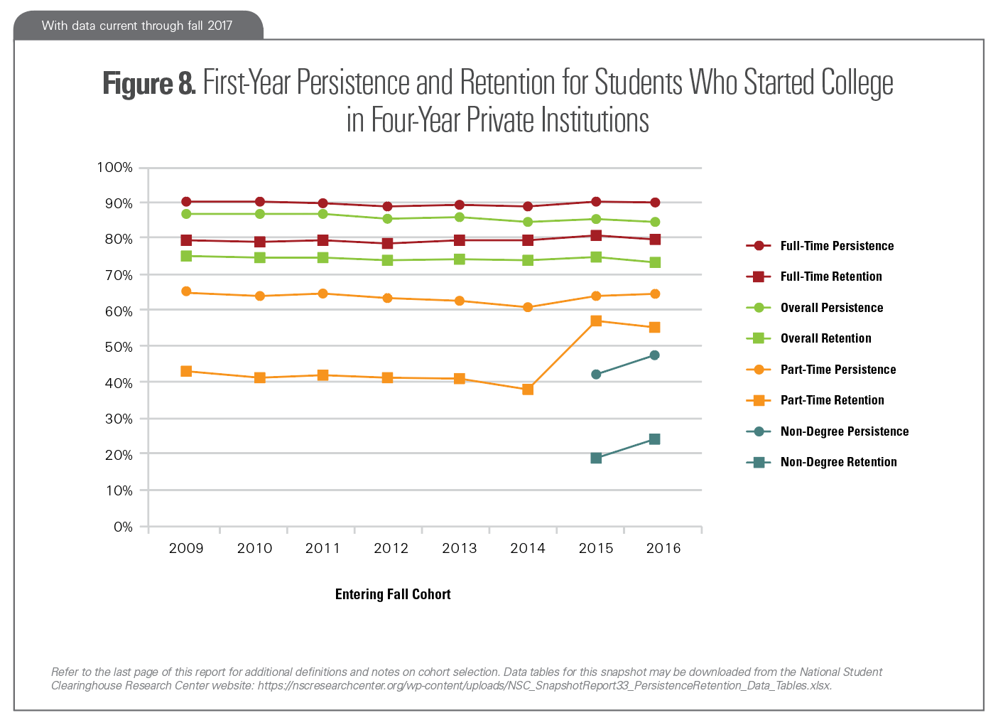 For students who started college in fall 2016 at four-year private institutions, the persistence rate was 85.0 percent, up 0.1 percentage point from the prior year, and down 2.5 percentage points in comparison to the fall 2009 cohort. The persistence rate was 90.2 percent for those who entered college on a full-time basis, compared to 64.8 percent for those who entered college on a part-time basis. Of all students who started college in this sector in fall 2016, 73.6 percent returned to the same institution in fall 2017.