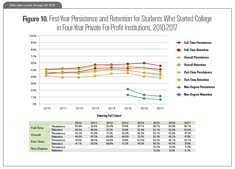 For students who started college in four-year private for-profit institutions, the persistence rate was 47.2 percent, down 5.7 percentage points from the prior year cohort, and down 3 percentage points in comparison to the fall 2010 cohort. The persistence rate was 55.7 percent for those who entered college on a full-time basis, compared to 43.7 percent for those who entered college on a part-time basis. Of all students who started college in this sector in fall 2017, 41.9 percent returned to the same institution in fall 2018.