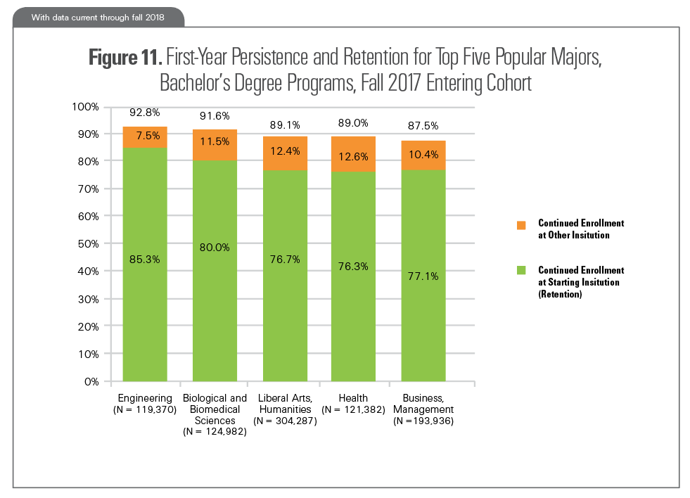 Refer to the last page of this report for additional definitions and notes on cohort selection. Download the data tables for this snapshot.Popular majors are defined by enrollment sizes. N is the total enrollment in the specified field of major as of fall 2017. Major fields shown are: Engineering (CIP code 14), Biological/Biomedical Sciences (26), Liberal Arts (24), Health (51), and Business (52).