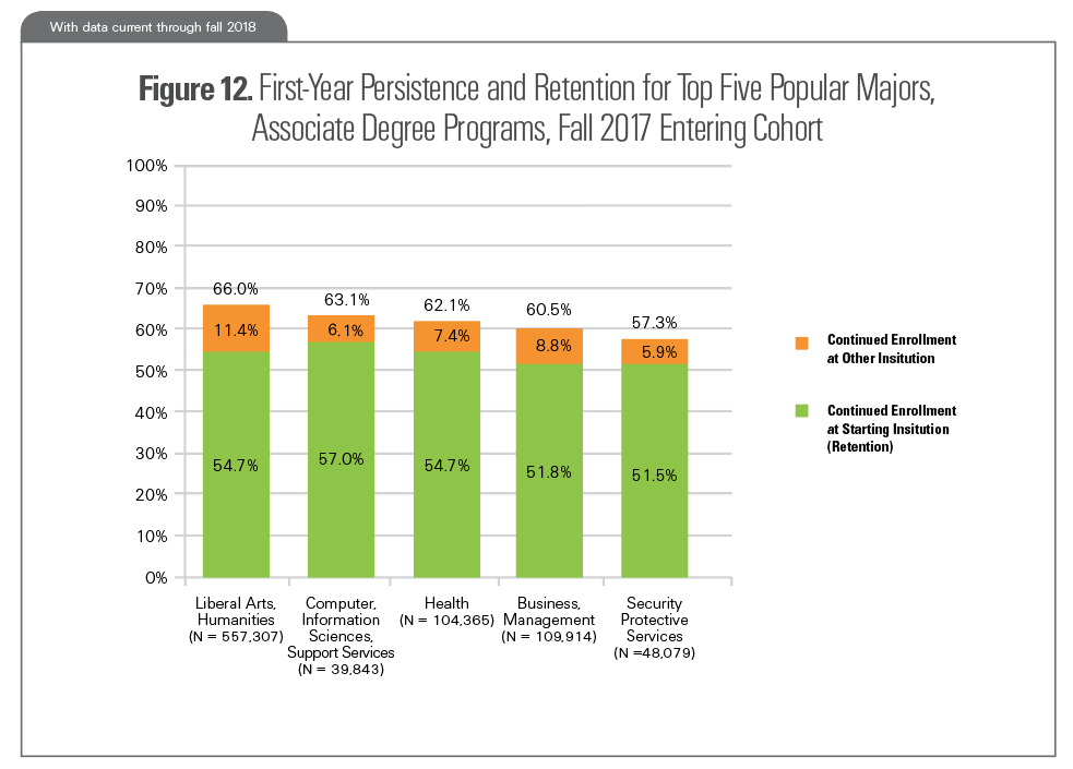 Refer to the last page of this report for additional definitions and notes on cohort selection. Download the data tables for this snapshot.Popular majors are defined by enrollment sizes. N is the total enrollment in the specified field of major as of fall 2017. Major fields shown are: Liberal Arts (CIP code 24), Computer Information (11), Health (51), Business (52), and Security Protective Services (43).