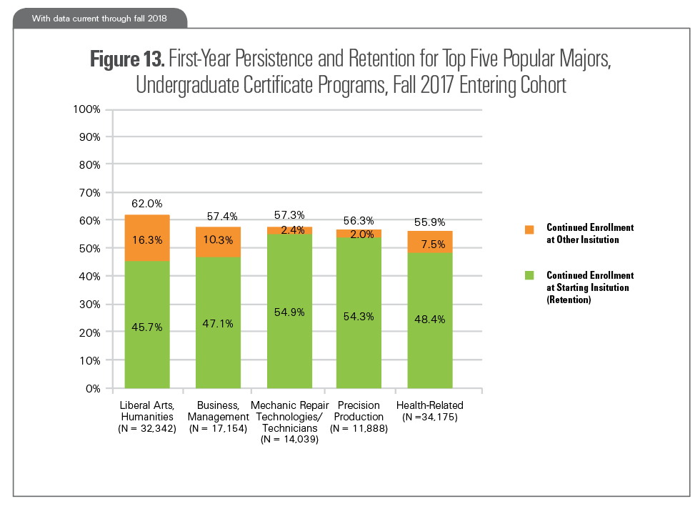Refer to the last page of this report for additional definitions and notes on cohort selection. Download the data tables for this snapshot.Popular majors are defined by enrollment sizes. N is the total enrollment in the specified field of major as of fall 2017. Majors shown are: Liberal Arts (CIP code 24), Business (52), Mechanic Repair (47), Precision (48), and Health (51).