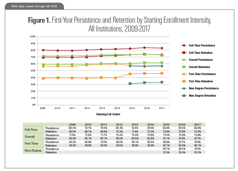 Beginning with the fall 2015 entering cohort, retention and persistence rates are reported for non-degree, non-certificate-seeking students in a separate category. Previously, these students were included in the full-time and part-time categories. Previous results for all cohort years after 2014 have been revised to reflect this change.