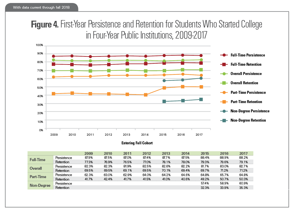 For students who started college in fall 2017 at four-year public institutions, the persistence rate was 82.7 percent, down 0.3 percentage points from the prior year, and up 0.4 percentage points in comparison to the fall 2009 cohort. The persistence rate was 88.2 percent for those who entered college on a full-time basis, compared to 64.8 percent for those who entered college on a part-time basis. Of all students who started college in this sector in fall 2017, 71.2 percent returned to the same institution in fall 2018.