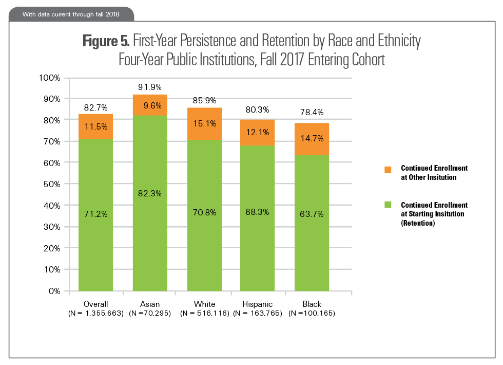Among students who for the first time entered college in fall 2017, Asians had the highest persistence rate (84.7 percent), with 72.7 percent returning to the starting institution and 12 percent returning to an institution other than the starting institution in fall 2018. Black students had the lowest persistence rate (66.2 percent): just over half of black students returned to the starting institution (52.1 percent) and an additional 14.1 percent continued at a different institution.