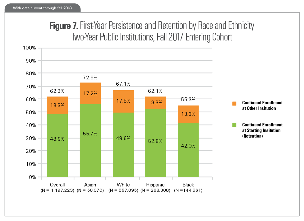 Among students who entered college at two-year public institutions in fall 2017, white students had a higher first-year persistence rate (67.1 percent) than Hispanic students (62.1 percent). However, white students had a lower retention rate (49.6 percent) than Hispanic students (52.8 percent). This reflects the fact that white students are more likely than Hispanic students to transfer to other institutions by their second fall term. Black students had the lowest persistence rate (55.3 percent), with 42 percent returning to the starting institution and 13.3 percent continued enrollment at a different institution in fall 2018.