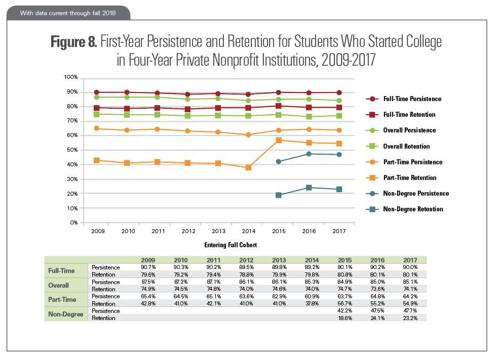 For students who started college in fall 2017 at four-year private nonprofit institutions, the persistence rate was 85.1 percent, up 0.1 percentage point from the prior year cohort, and down 2.4 percentage points in comparison to the fall 2009 cohort. The persistence rate was 90 percent for those who entered college on a full-time basis, compared to 64.2 percent for their part-time counterparts. Of all students who started college in this sector in fall 2017, 74.1 percent returned to the same institution in fall 2018.